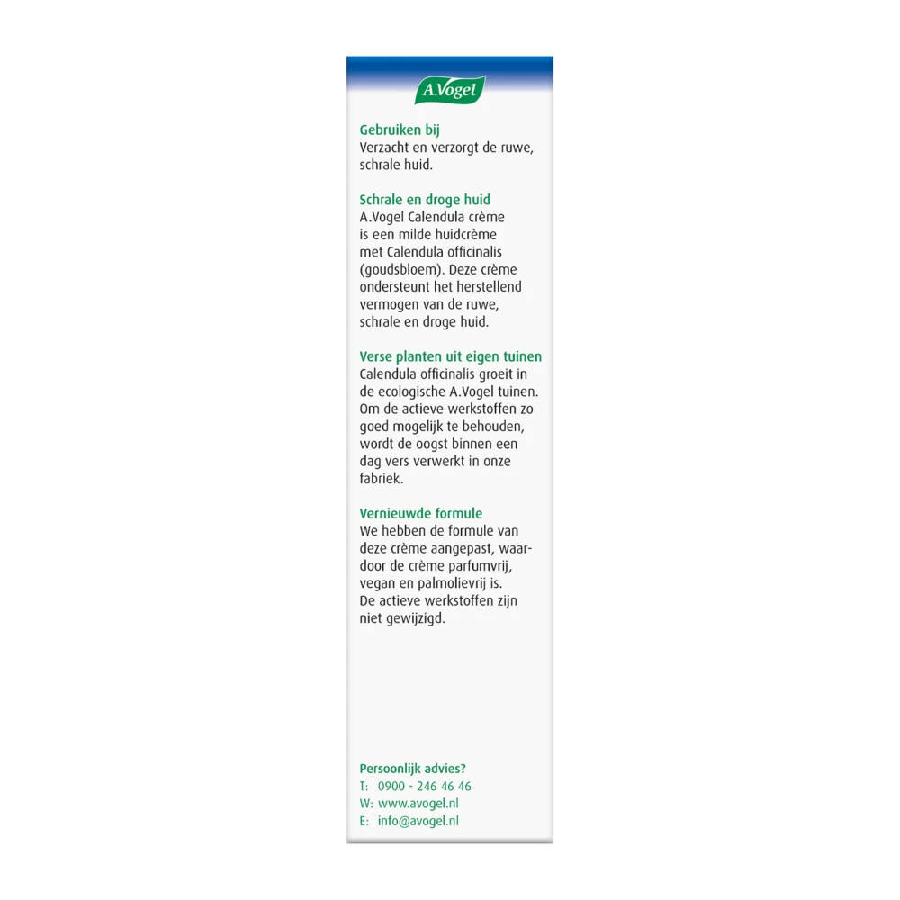 A.Vogel Crème Calendula bevordert herstel van de huidCrème Calendula van A.Vogel is een milde huidcrème die een schrale huid helpt deze te herstellen. Crème Calendula is ook heel goed te gebruiken als Aftersun, de crème verkoelt en verzorgt de huid die verbrand is door felle zon.Verzorgt en verzacht een schrale huidBevordert het herstel van de huidVerkoelt en verzorgt de huid bij zonnebrand.Bevat rustgevende lavendel100% natuurlijk