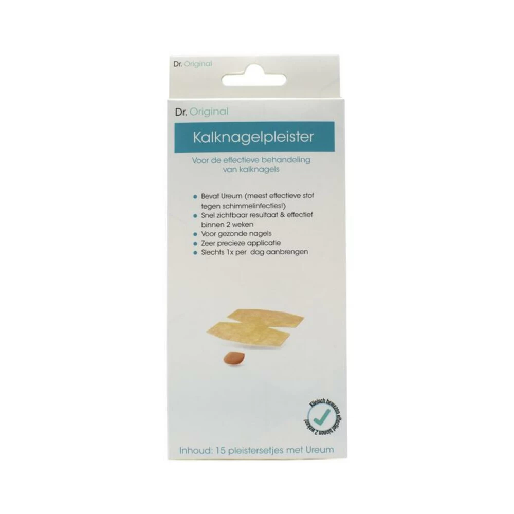 Dr. Original Kalknagelpleister De Kalknagelpleister van Dr. Original werken effectief bij de behandeling van de eerste tekenen van kalknagels bij vingers of tenen. De werkzame stof in de pleister is 40% Ureum. Ureum zorgt ervoor dat de pH-waarde van de nagels te verandert waardoor het zieke deel van de nagel wordt verzwakt en het verwijderen ervan eenvoudiger wordt. De verbetering van de nagel is en de nagel na ongeveer 2 weken hbehandelen zichtbaar. Het is belangrijk om de behandeling te s