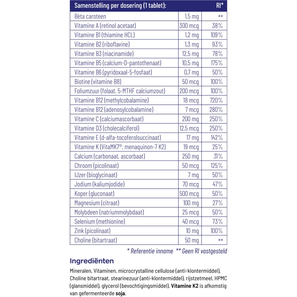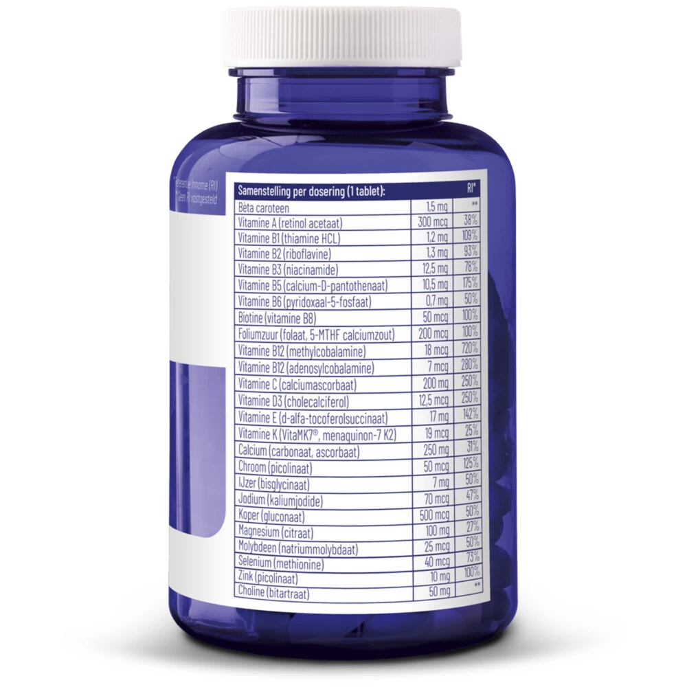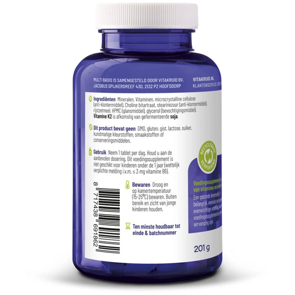 Vitakruid Multi Basis Vitakruid Multi Basis Tabletten is een multivitamine met alle met alle nutriënten in de best opneembare vormen wereldwijd. Vitakruid Multi Basis Tabletten bevat alle vitaminen en mineralen in minimale doseringen en geen kruiden, aminozuren of enzymen in verwaarloosbare hoeveelheden. Vitakruid Multi Basis Tabletten is perfect voor diegenen die de behoefte hebben aan lichtere doseringen in de juiste verhoudingen, en dat alles in een dagdosering van slechts &ea