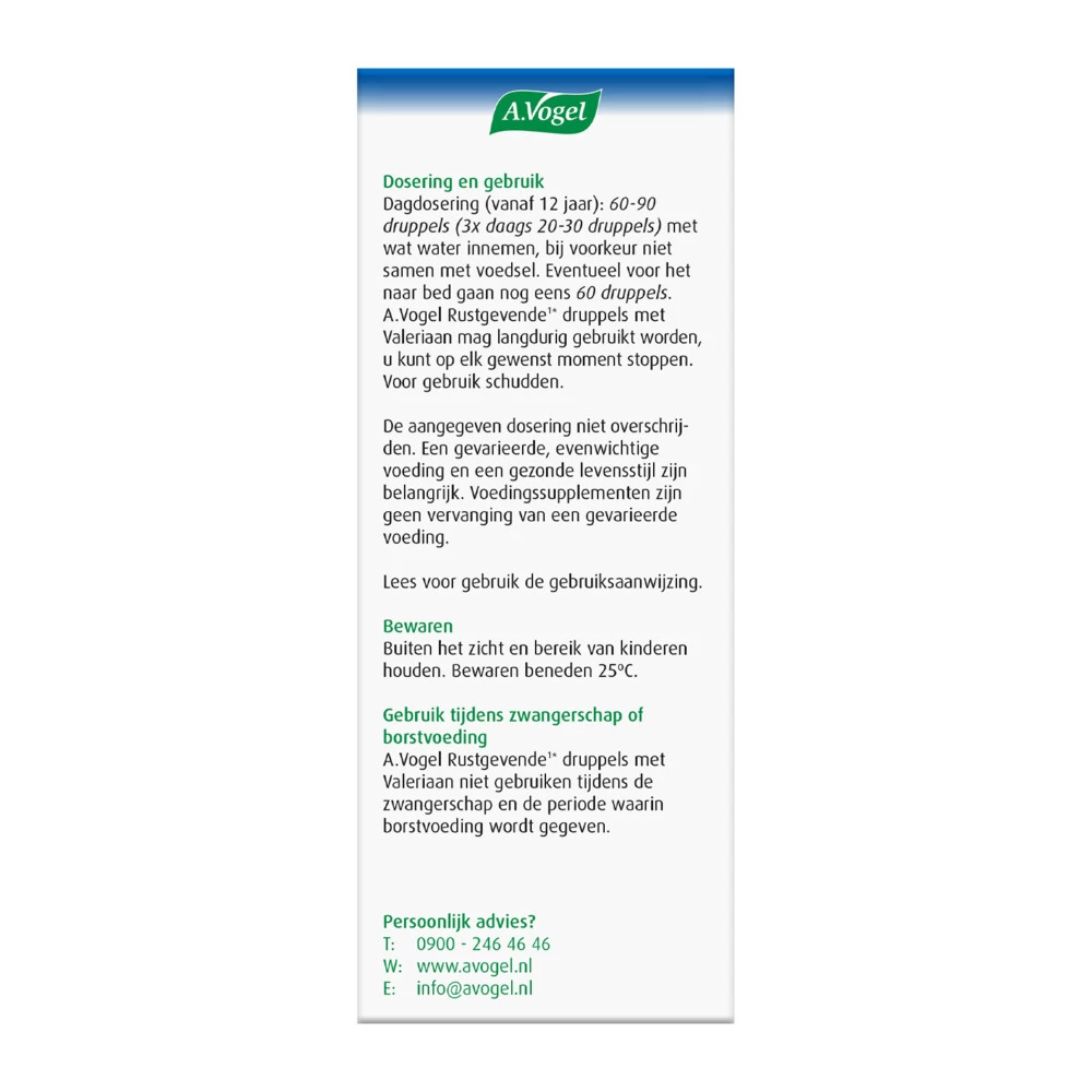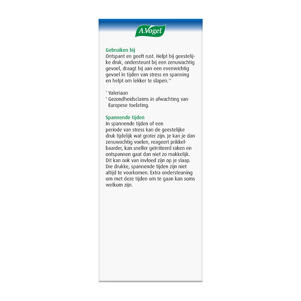 A.Vogel Valeriaan druppelsA.Vogel Valeriaan Ontspannend en Rustgevende1* druppels is een kruidenpraparaat op basis van Valeriaan. Valeriaan helpt bij geestelijke druk*, rusteloosheid*, gespannenheid* en zorgt voor evenwichtigheid tijdens spannende periodes*. Daarnaast helpt Valeriaan ook om lekker te kunnen slapen*.1 Valeriaan*Gezondheidsclaims in afwachting van Europese toelating.