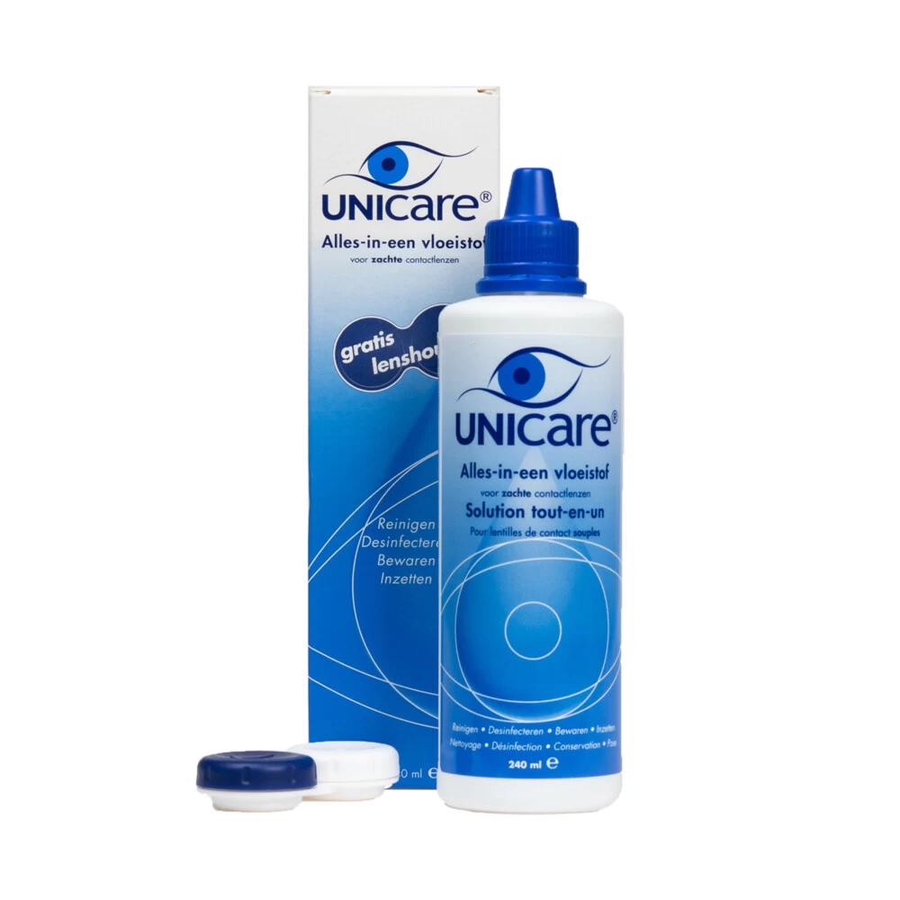 Lenzenvloeistof zachte lensUnicare alles-in-een vloeistof voor zachte contactlenzen Een vloeistof die geschikt is voor het dagelijks schoonmaken, reinigen, bewaren en inzetten van zachte contactlenzen.