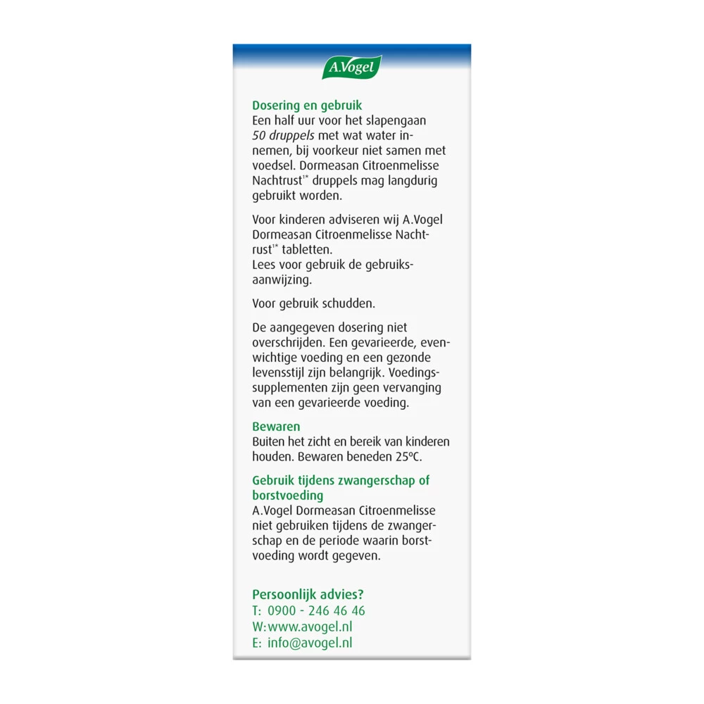 A.Vogel Dormeasan Citroenmelisse om lekker te slapen1*A.Vogel Dormeasan Citroenmelisse Nachtrust1* Druppelshelpt om lekker te slapen1*. Dormeasan Citroenmelisse Nachtrust1* druppels bevat een combinatie van vijf verschillende ingrediënten: passiebloem, citroenmelisse, haver, valeriaan en hop. A.Vogel Dormeasan Citroenmelisse helpt om lichaam en geest te ontspannen, lekker te slapen en uitgerust wakker te worden1*. De natuurlijke slaap blijft intact en je kunt op elk gewenst moment weer stop