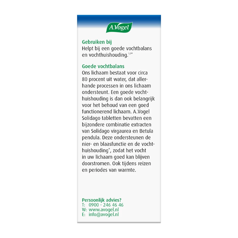 A.Vogel Solidago Goede vochthuishoudingA. Vogel SolidagoVochthuishouding1,2*Solidago Vochthuishouding1,2* tabletten van A.Vogel ondersteunt een goede nier- en blaasfunctie* en stimuleren de vochthuishouding* door de bijzondere combinatie van extracten van Solidago virgaurea en Betula pendula. Deze ingrediënten ondersteunen een goede nier- en blaasfunctie en een goede vochthuishouding*, zodat het vocht in je lichaam goed kan blijven doorstromen.Helpt bij een goede vochtbalans1,2*Ondersteunt