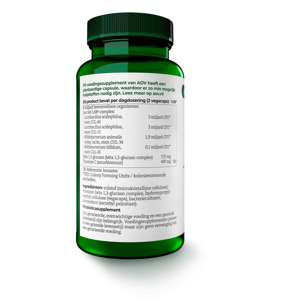 Probiotica ComplexAOV 1203 Probiotica Complex bevat naast vitamine C ook een hoge dosering probiotica (8 miljard bacteriën per vegacaps en bèta 1,3 glucaan. De bacteriën in 1203 Probiotica Complex behoren tot verschillende stammen van de lactobacillus en bifidobacterium soorten. 1203 Probiotica Complex bevat een gezuiverd glucaan isolaat en kan met een gerust gevoel door mensen met een gistintolerantie worden gebruikt. Bèta-glucanen worden onder meer aangetroffen in bepaa