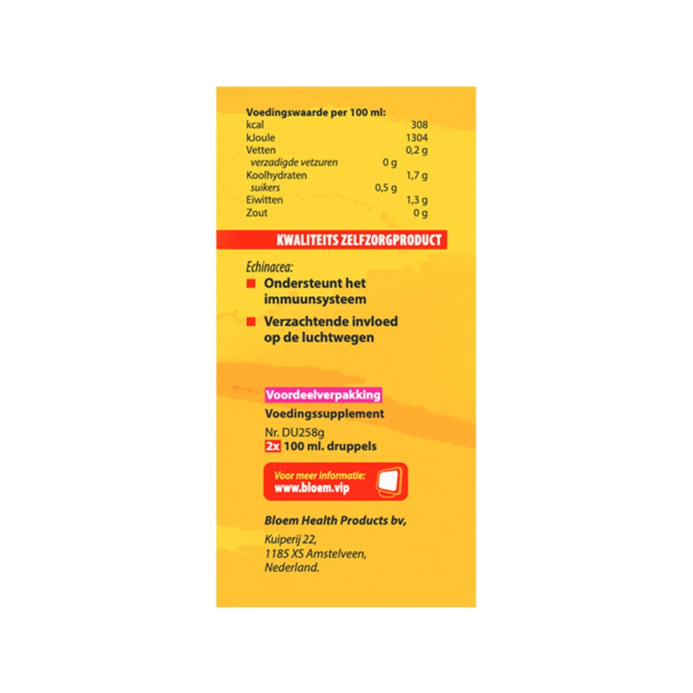 Echinacea ondersteunt het immuunsysteem*Bloem Echinacae Extra Forte nr. 258 heeft als hoofdbestanddeel Echinacea. Echinacea ondersteunt het immuunsysteem en heeft daarnaast een verzachtende invloed op de luchtwegen. Echinacea Extra Forte tinctuur is geschikt voor het hele gezin. Duo verpakking Echinacea:Ondersteunt het immuunsysteem*Verzachtende invloed op de luchtwegen*Druppels voor het hele gezinDuoverpakking* = Gezondheidsclaim in afwachting van goedkeuring door de Europese Commissie