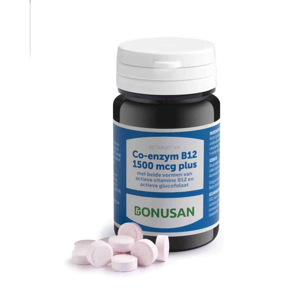 Bonusan Co enzym B12 1500 mcg plusHet Co enzym B12 van Bonusan bevat biologisch actieve adenosyl- en methylcobalamine. Deze vormen worden beter opgenomen in het lichaam dan gewone vitamine B12. Vitamine B12 is het moeilijkst opneembare vitamine. Het is daarom extra belangrijk om de juiste vorm te gebruiken. Vitamine B12 ondersteunt de;Energieleverend metabolismeWerking van het zenuwstelselPsychologische functieVorming van rode bloedcellenWerking van het immuunsysteemVerminder
