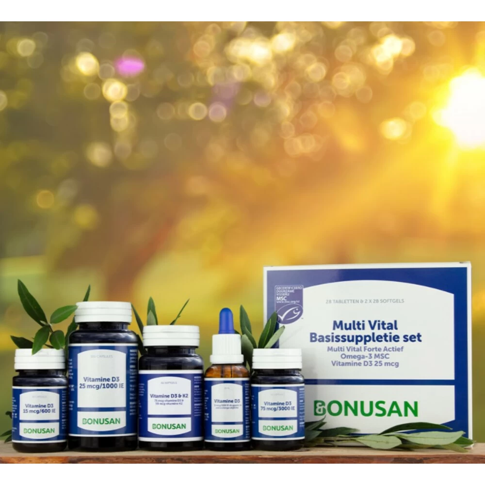 Bonusan Multi Vital Basissuppletie SetBonusan Multi Vital Basissuppletie Set levert de drie belangrijkste en best verkochte Bonusan basis-supplementen in een handige maandverpakking. Het zorgt ervoor dat u iedere dag alle vitaminen, mineralen en omega-3-vetzuren in de best opneembare vorm binnenkrijgt.Vier handige blisters in één maandverpakkingDagelijks omega-3, vitamine D3 en multivitamineMet extra goed opneembare vitaminen en mineralenMakkelijk slikbaar en prettig in het gebruik