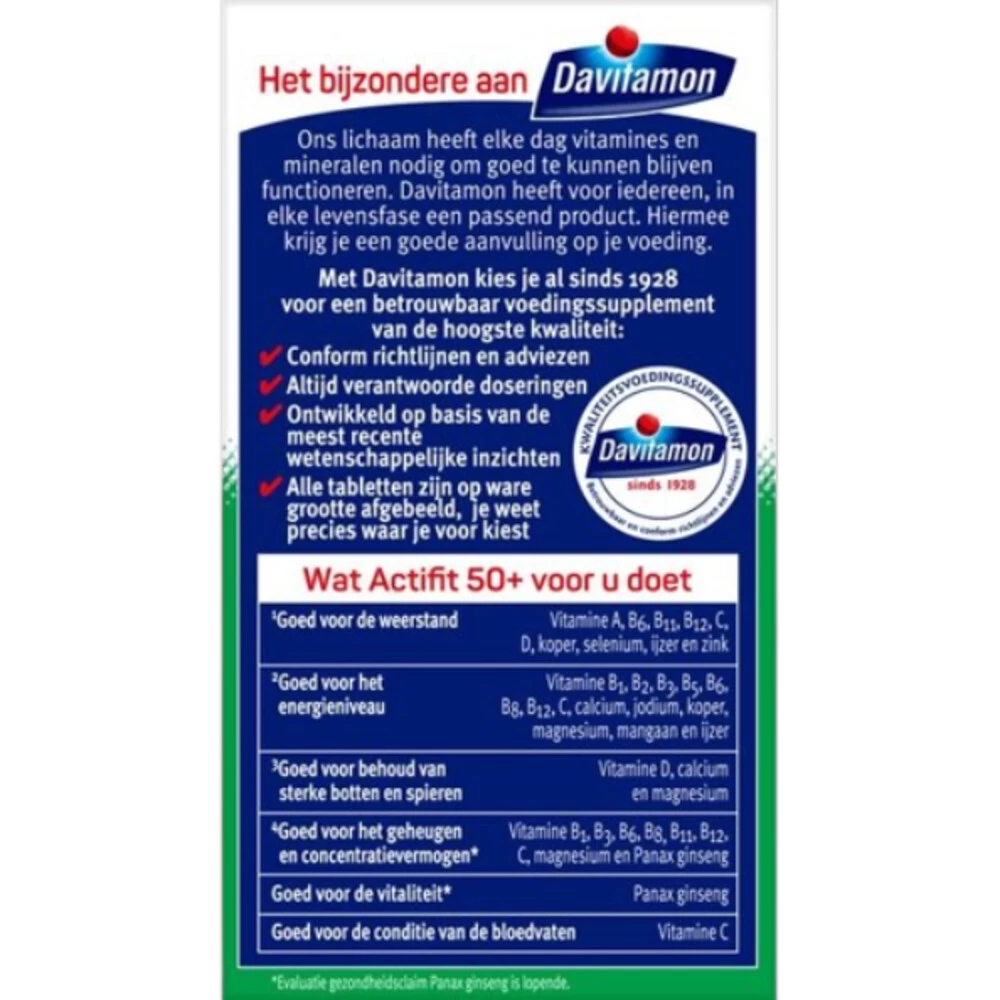 Davitamon Tabletten voor een evenwichtige levensstijlDavitamon Actifit 50+ is een multivitamine speciaal ontwikkeld voor de 50 plusser. Deze multivitamine voorziet in de specifieke behoeften aan vitamines en mineralen bij het ouder worden, aangevuld met ginseng.
