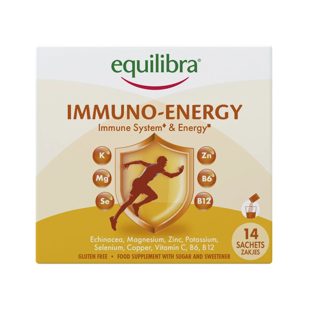 Equilibra Immuno Energy*Equilibra Immuno Energy is een voedingssupplement dat bestaat uit 5 Mineraalzouten en 3 Vitaminen. Deze complete formule helpt je immuunsysteem1 sterk houdt en vermindert vermoeidheid2. Echinacea-extract ondersteunt de natuurlijke afweer van het lichaam.Zink, selenium, koper en vitamine C dragen bij aan de normale werking van het immuunsysteem.Immuno Energy draagt ook bij aan de vermindering van vermoeidheid en aan een normaal energiemetabolisme dankzij het Magnesium