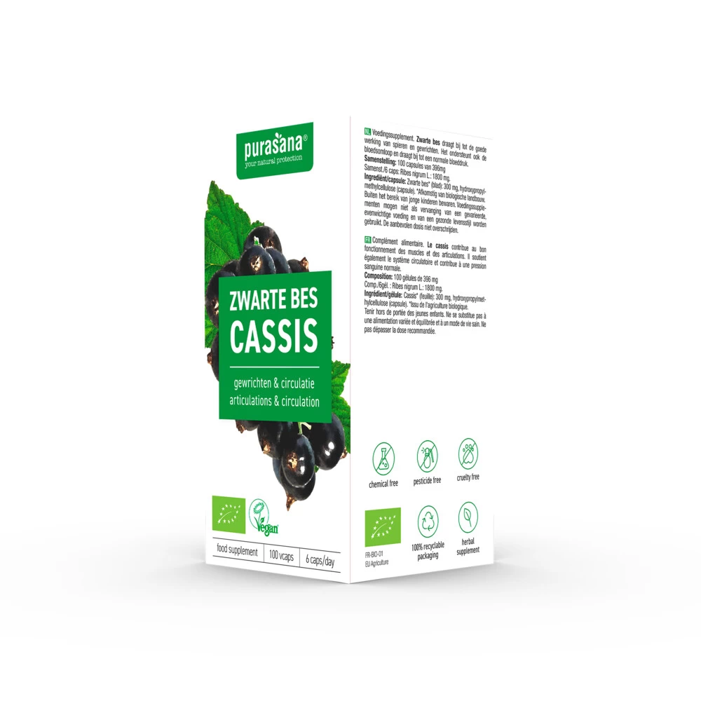 Purasana Zwarte Bes 300 mg Zwarte bes is een bekende plant die in grote delen van Europa en Azië voorkomt. Je kunt er jam van maken en het wordt gebruikt voor het maken van cassis. Purasana Zwarte bes wordt gemaakt van de bladeren van de zwarte bes, ook wel bekend als ribes nigrum.Voor het behoud van soepele gewrichten*Draagt bij tot de normale werking van spieren*Helpt op gewicht te blijven**Gezondheidsclaim in afwachting van goedkeuring door de Europese Commissie
