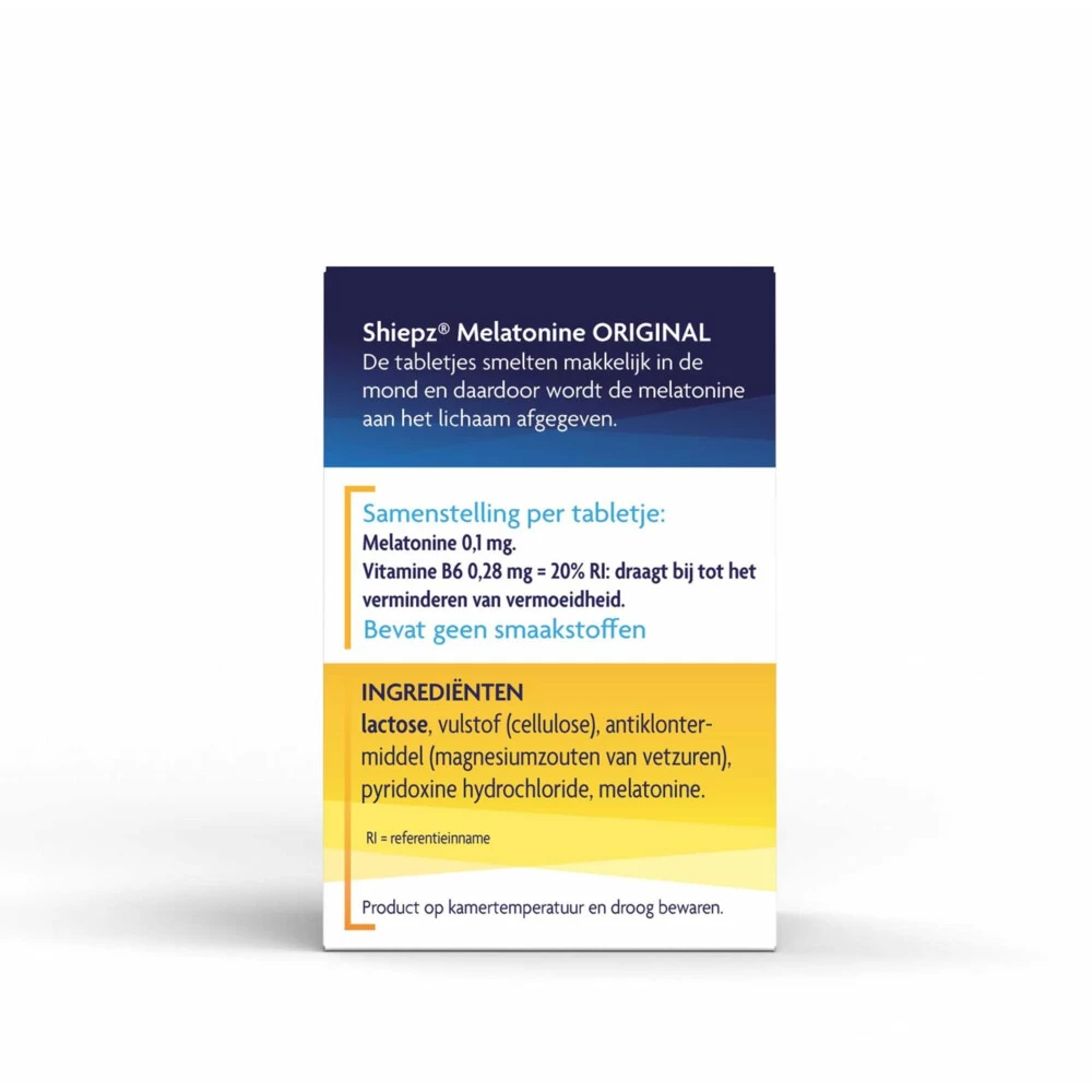 Shiepzz Melatonine 0,1mg Original SmelttabletjesShiepz Melatonine Original bevat 0.1 milligram melatonine per tabletje. Je laat het tabletje onder je tong smelten waardoor de tabletjes makkelijk oplossen en de melatonine snel aan het lichaam wordt afgegeven. De tabletjes geven geen gewenning waardoor je ze langere tijd achtereen kunt gebruiken.Makkelijk te doserenZachte smelttabletjesGeeft geen gewenningVrij van geur-, kleur- of smaakstoffen en conserveermiddelenGeschikt voor vegetariërsVoo