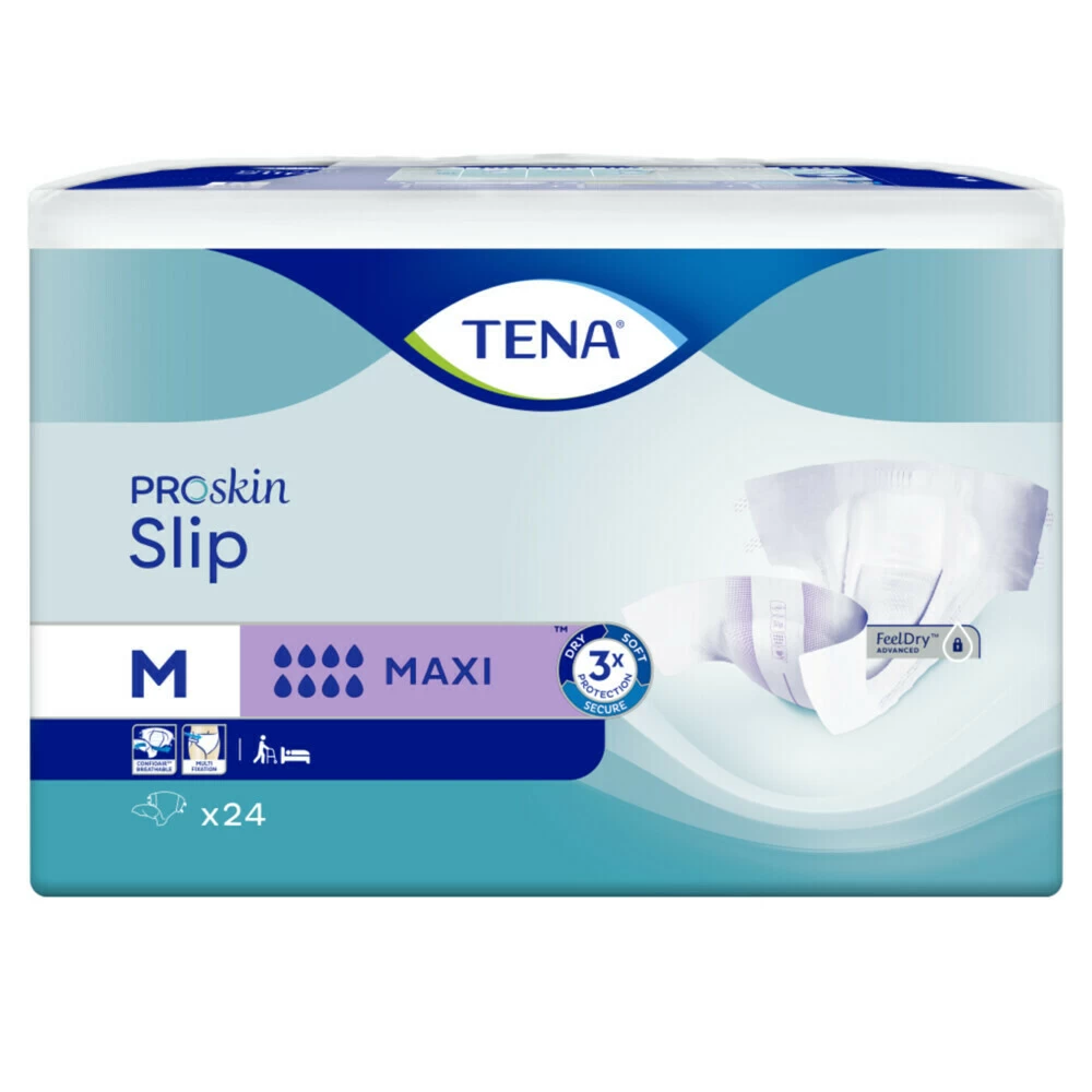 TENA Slip Maxi Medium ProSkinMedisch Hulpmiddel: TENA Slip Maxi Medium ProSkin is een open, eendelig incontinentie product met verstelbare strips voor een perfecte pasvorm, comfort en bescherming tegen doorlekken.Drievoudige bescherming voor een gezonde huidFeelDry Advanced houdt de huid droogSterk absorberende kern voor bescherming tegen doorlekkenAdemend materiaal dat aanvoelt als textielExtra brede klittenbandstrips zorgen voor een comfortabele pasvormDermatologisch getestUrine-indicator toon