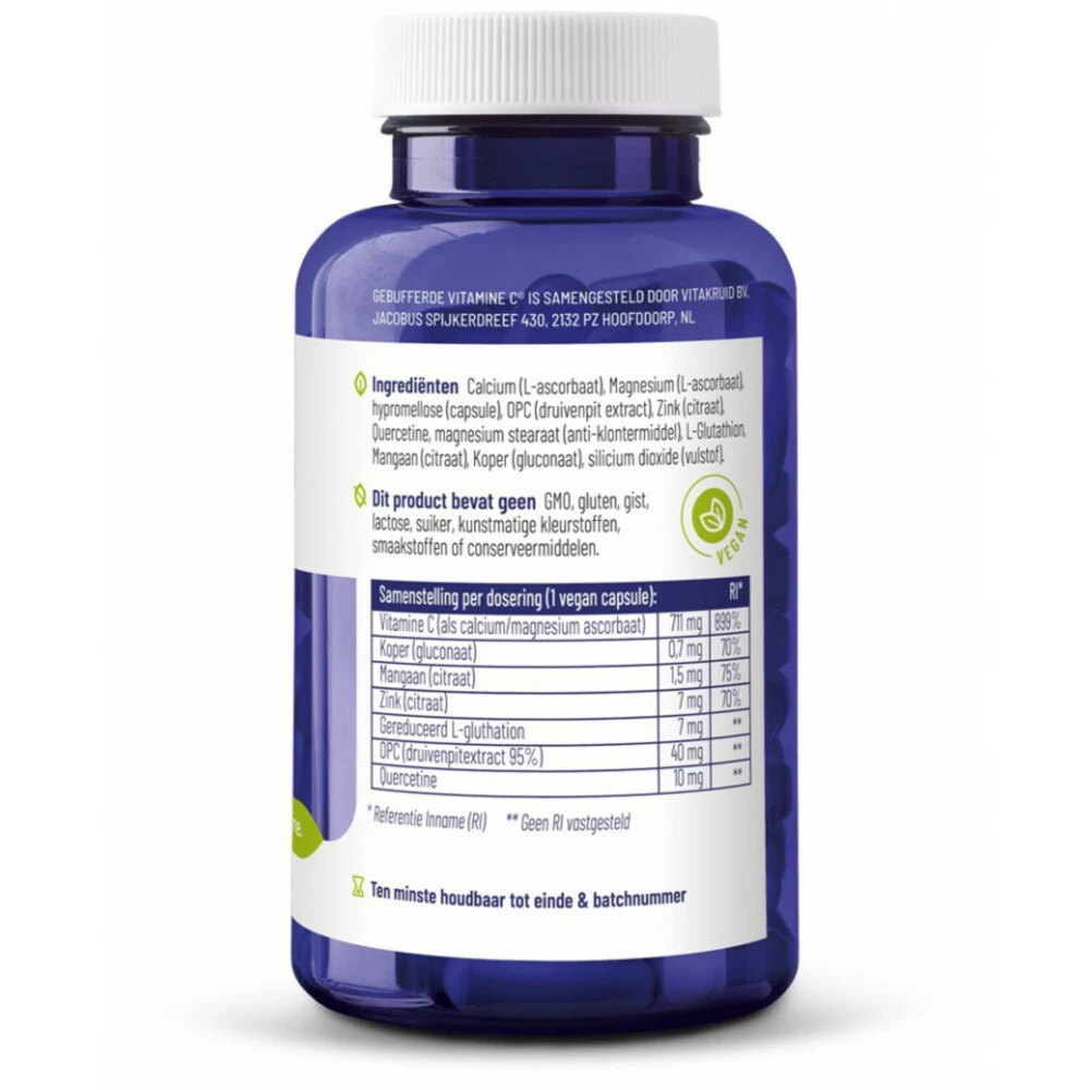 Vitakruid Gebufferde Vitamine CVitakruid gebufferde vitamine C heeft samen met koper en zink een positieve invloed op het immuunsysteem. Hoge dosering vitamine C als calcium/magnesium ascorbaatDe antioxidanten mangaan, zink en koperTurbo voor de overige ingrediënten OPCDe krachtige nutriënten L-glutathion en quercetineVegacapsules*Goedgekeurde gezondheidsclaims