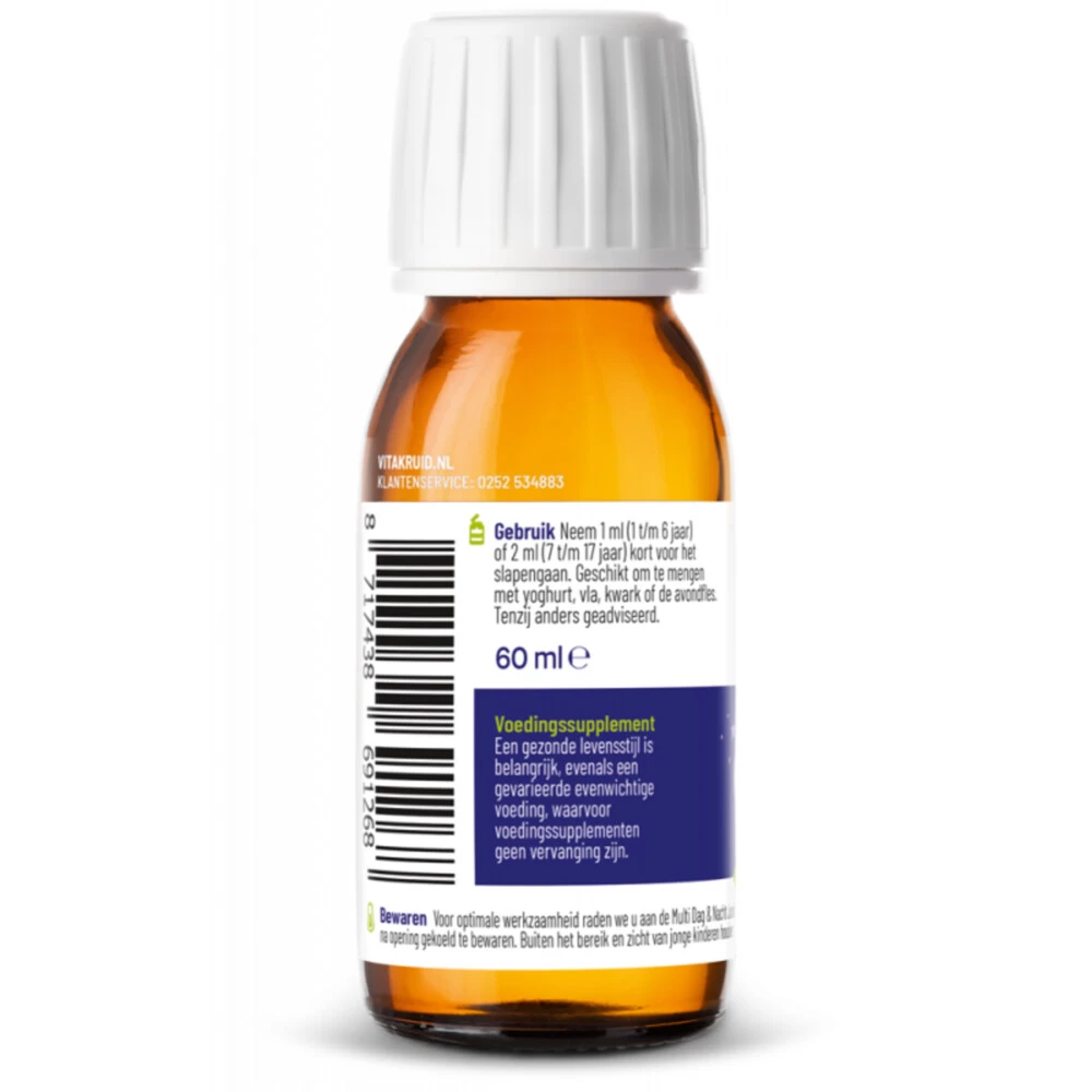 Vitakruid Multi Nacht JuniorVitakruid Multi Nacht Junior is een multi specifiek voor de behoeften van de nacht. ’s Nachts is het fijn als je kind ondersteund wordt in zijn psychologische en fysieke gesteldheid. Vitakruid Multi Nacht Junior houdt rekening met het bioritme van je kind. En daarom bevat de Multi Nacht Junior onder andere vitamine D, voor de opbouw van sterke botten en vitamine A, voor het herstellend vermogen van de huid*Multi nacht specifiek voor de behoeften in de nachtDe Mu