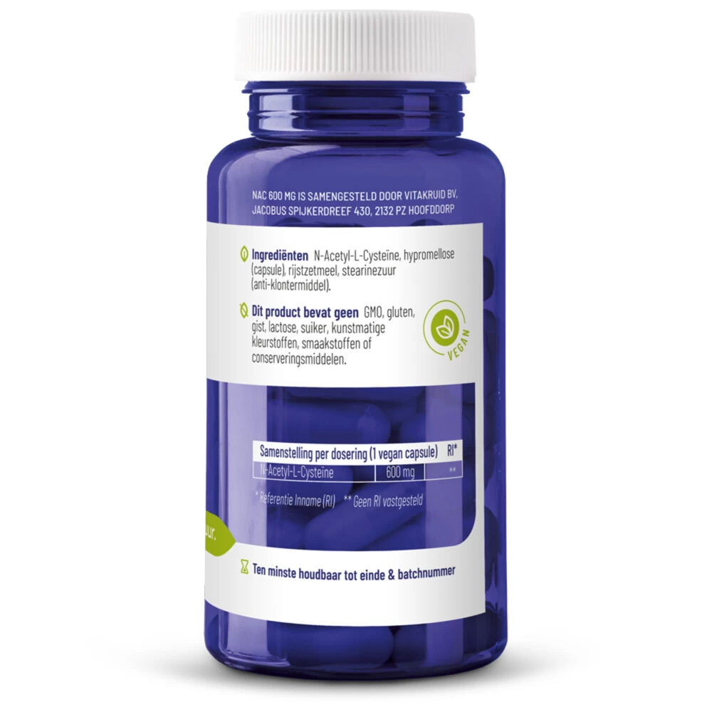 Vitakruid Nac 600 mgVitakruid NAC 600mg N-Acetyl-L-Cysteïne Capsules is een voedingssupplement op basis van het semi-essentieel aminozuur N-acetyl-l-cysteïne. In bepaalde omstandigheden bijv. na een operatie, dieet of zware sportbeoefening kan een tekort aan het semi-essentiële aminozuur cysteïne ontstaan. In deze situaties is het dan ook raadzaam een supplement te nemen. Bovendien zorgt de verbinding van cysteïne met acetyl voor een goede opname in het lichaam. Daarnaas
