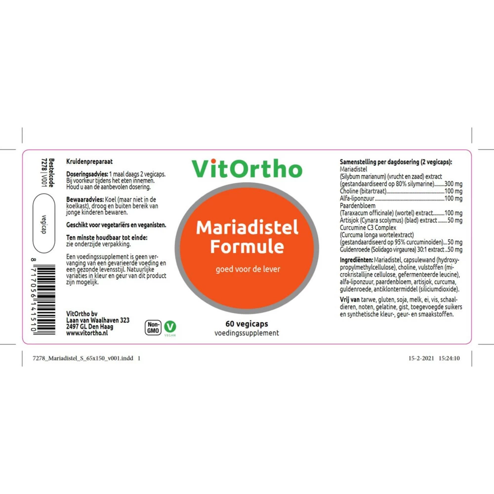 Vitortho Mariadistel FormuleVitortho Mariadistel Formule is een voedingssupplement op basis van kruiden. Vitortho Mariadistel Formule bevat Mariadistel en Choline. Mariadistel ondersteunt de reinigende werking van de lever* en Choline draagt bij tot de instandhouding van de normale leverfunctie.Kenmerken van Vitortho Mariadistel FormuleGeschikt voor vegetariërs en veganistenMariadistel ondersteunt de reinigende werking van de lever* (EFSA-ID 3585)Choline draagt bij tot de instandhouding van